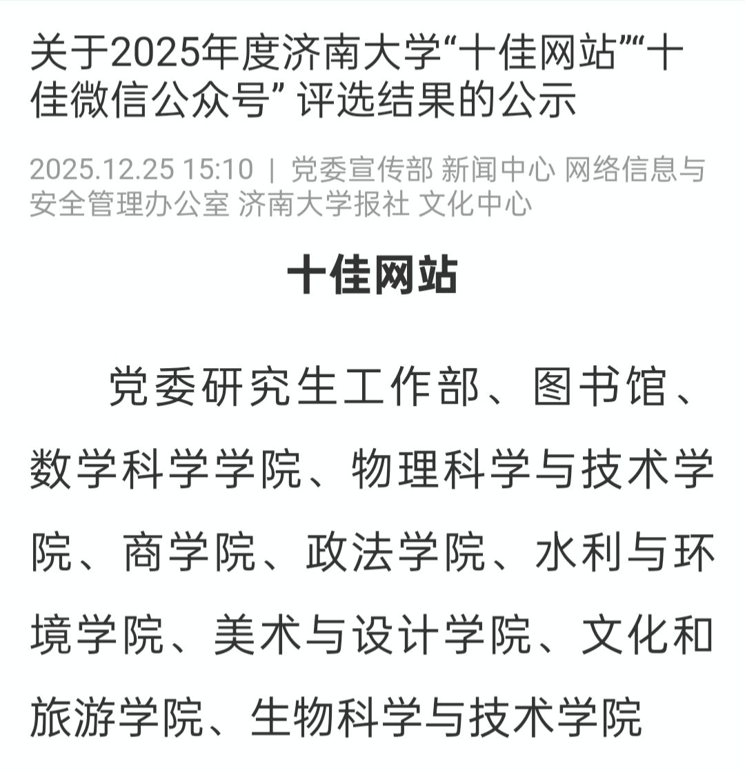 网站凭借扎实的运营功底、优质的内容产出与鲜明的学科特色,历经层层严苛选拔,结合网上投票口碑与综合贡献度等核心指标考量,成功斩获“十佳网站”荣誉称号!至此,学院已连续三年获此殊荣,彰显了学院宣传思想文化工作的持续影响力与过硬实力。