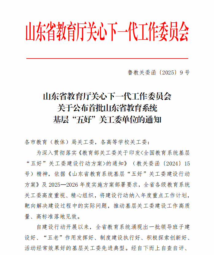 “五好”关工委建设是山东省教育系统为促进基层关工委组织规范化、高质量发展而实施的重要举措,旨在对领导班子建设、“五老”作用发挥、制度执行、探索创新及活动成效等方面表现突出的单位予以评选表彰。学院关工委始终紧密围绕学院中心工作,以服务青年师生成长成才为核心,联合校内外有关单位组织多种类型活动,在红色文化宣讲和新生入学教育上都发挥了独特作用,为学院的育人工作做出了贡献。